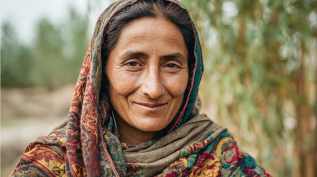 A joyful woman 45 years old from Afghanistan displays a bright smile while wearing traditional clothing. She stands confidently, embodying a sense of peace in her rural community. Generative AI.