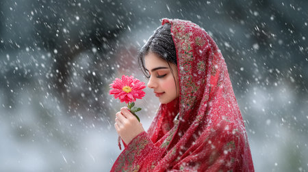 Generative AI Image of Indian Girl Wearing Veil Holding Flower in Snow Winter Season