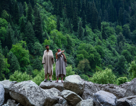 Kashmir, India - Jul 23, 2015. Indian men standing on mountain in Jammu and Kashmir, India. Jammu and Kashmir is the only state in India with a Muslim-majority population.