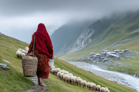 A local woman walks along a path, guiding sheep while carrying baskets in a tranquil valley.