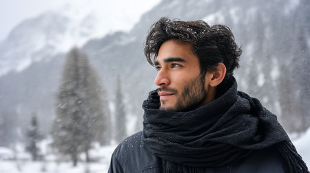 Portrait of a handsome mature man with beard and mustache wearing scarf in the mountains