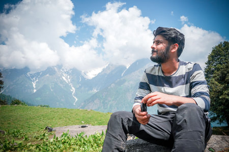 A young Indian man sitting on the rock with the mountains in a background
