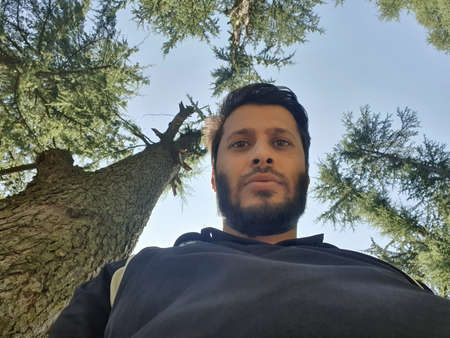 a handsome young man wearing a hoodie and looking into the camera with stern facial expressions in the evening. trees, clear blue sky and mountains in background. evening sunlight