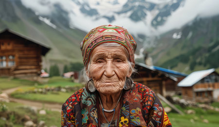 Portrait of an old woman, an indigenous resident of a Caucasian mountain village, in national clothes, personifying the national image of a mountain man
