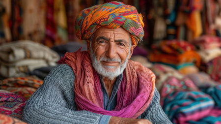 A portrait of a senior Yemeni man wearing a vibrant turban, smiling warmly in a traditional market surrounded by colorful textiles.