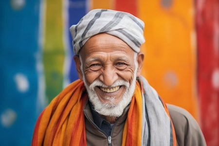 Portrait of a happy senior man with a colorful scarf on the street