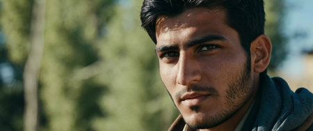 A young man from Afghanistan beams with a cheerful smile, basking in the warm sunlight. He stands in a rural area, showcasing the beauty of his homeland with joy and pride. Generative AI.