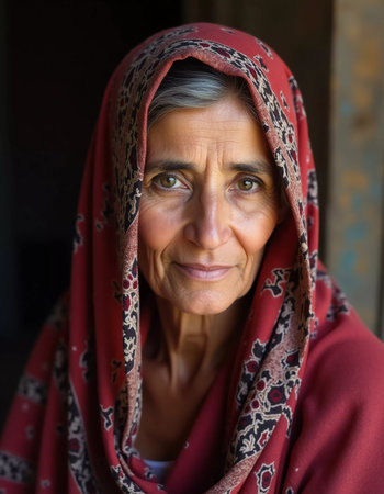 The elderly Afghanistan woman 75 years old gazes thoughtfully into the distance, her face marked by life experiences. She wears a traditional headscarf, set against a rustic background. Generative AI.