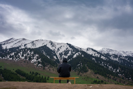 A man sitting on a bench in the mountains. Recreation in nature