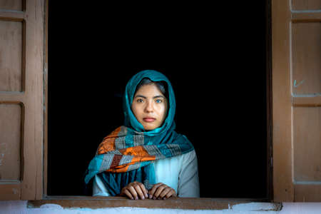 Ninh Thuan Province, Vietnam - January 16, 2021: An image of a Cham ethnic girl with two colored eyes, one green eye and the other brown eye in Ninh Thuan province, Vietnam