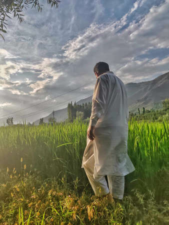 Rear view of a Muslim man praying in the rice field at sunset
