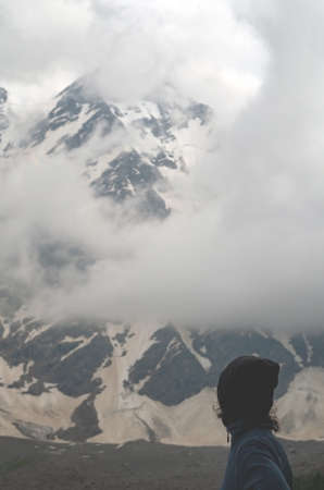 Kashmir, India - Jul 23, 2015. Indian men standing on mountain in Jammu and Kashmir, India. Jammu and Kashmir is the only state in India with a Muslim-majority population.