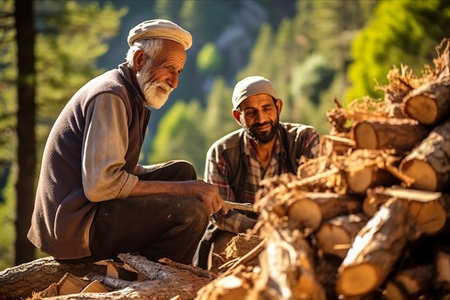 Embracing Tradition: Turkish Retired Senior Man & Family Gather Firewood in Altinkaya, Turkey's Enchanting Mountains