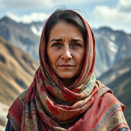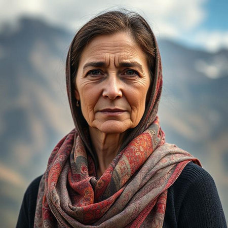 A mature Tajik woman 75 years old, gazes directly showcasing intricate traditional attire, rich cultural heritage of her nationality, evoking wisdom and grace. Brunette woman, wearing a headscarf. AI