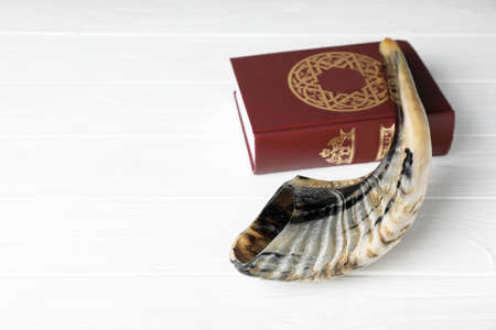 Shofar and Torah on white wooden table, space for text. Rosh Hashanah holiday symbols