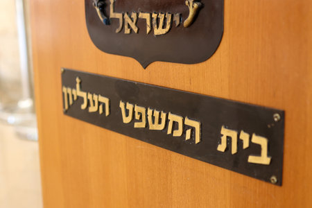 Entrance to the hearing room. Sign reading High Court of Justice.