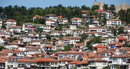 OHRID, MACEDONIA - AUGUST 7, 2019 : View of the buildings in Ohrid streets in Republic of Macedonia. Ohrid is UNESCO cultural heritage site.