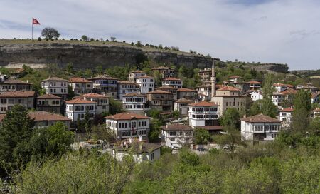 Safranbolu, Turkey - May 1, 2019: Touristic village with typical Turkish white houses and turkish flag.
