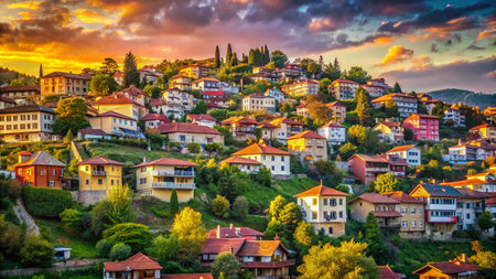 Aerial sunset view of village of Yavrovo with Authentic nineteenth century houses, Plovdiv Region, Bulgaria