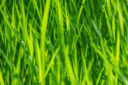 Rice field in the morning light. Close-up of green grass.