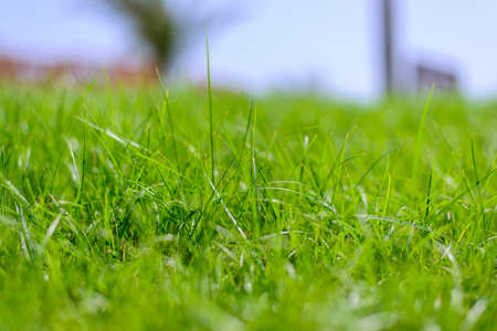 Close-up green lawn background and blurred