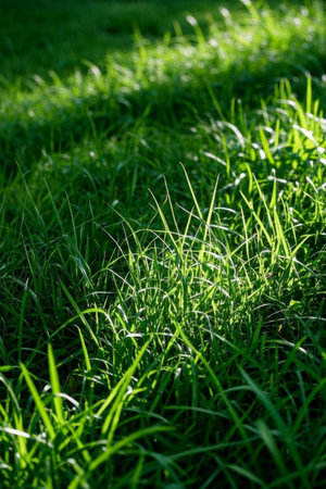 Close-up view of vibrant green grass blades illuminated by soft sunlight, with a blurred background of light and shadow.