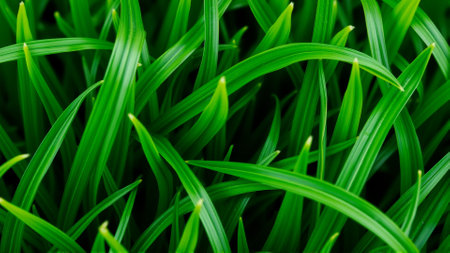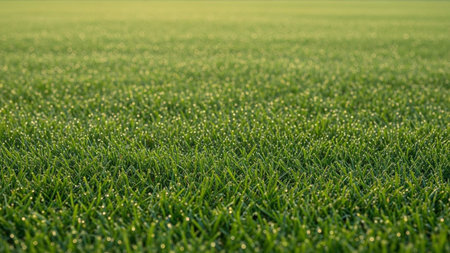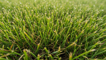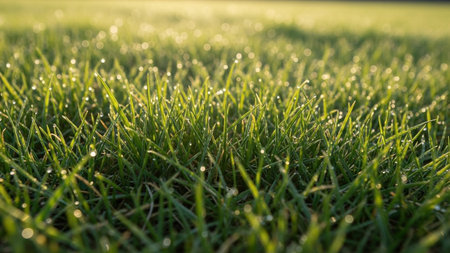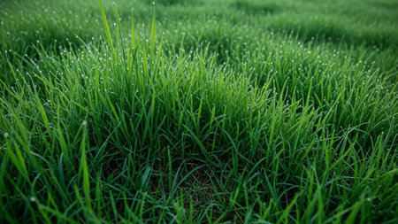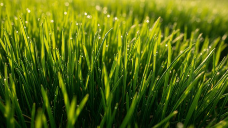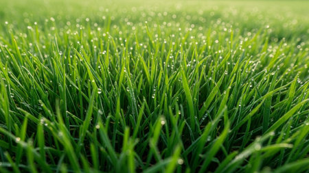 Close-up view of vibrant green grass blades adorned with numerous sparkling dew drops, creating a refreshing and...