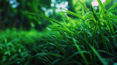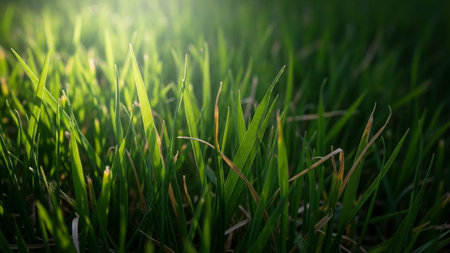 Close-up view of vibrant green grass blades with a soft, out-of-focus background illuminated by gentle sunlight, conveying a sense of natural freshness and peace.