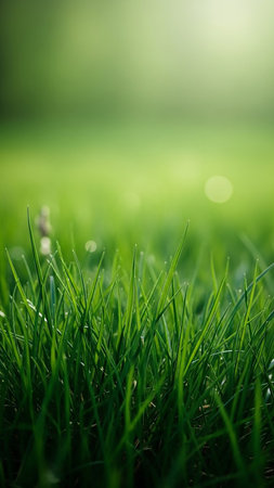 Discover the beauty of lush green grass adorned with dew drops, creating a serene atmosphere in a vibrant natural setting, inviting calmness and freshness.