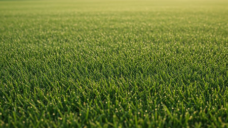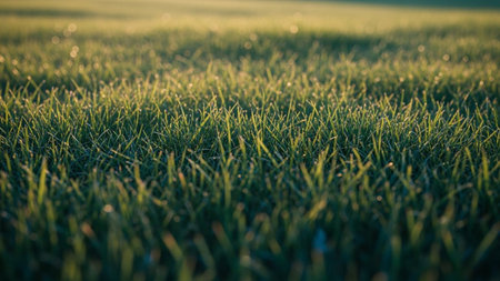Close-up view of vibrant green grass covered in glistening dewdrops. The early morning sun casts a warm golden glow, creating a serene and refreshing natural landscape perfect for relaxation and tranquility.