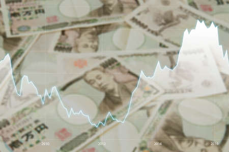 Double exposure of financial graph and blurred Japanese JPY Yen bank note pile background, Business and finance concept