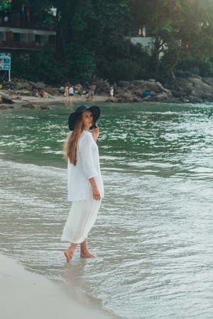 Young girl on blue sea background. Tropical country. Beach waves. Sunset. Dawn. Thailand Phuket Kata