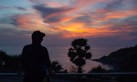 silhouette of loneliness traveler see sunset at Promthep cape, Phuket