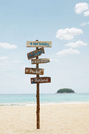 Tourist male traveler takes selfie at Patong Beach welcome name lettering letters sign signpost in Patong Kathu on Phuket island Thailand.