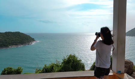 Asian woman taking photos on the sea of ​​Phuket, Thiland