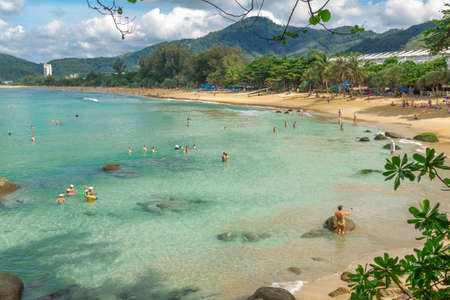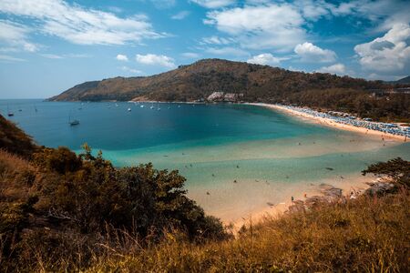 Wide angle view Nai Harn beach at phuket island on January 26-2023, Beautiful beach in thailand, Amazing High angle view sea in phuket Island with blue sky cloudy background, Travel holiday Concept