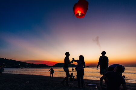 Silhouettes of people on the beach. Launching rice paper hot air balloons in the sky at sunset on a beach in Thailand.