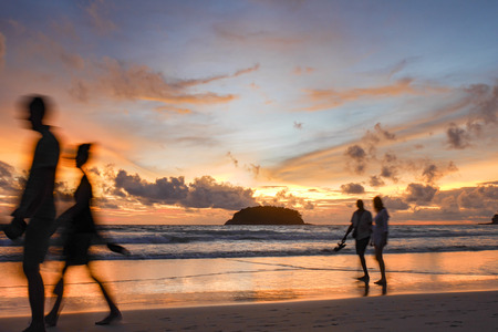 blurred people at the beach with twilight cloudy sky.There is an island in the sea