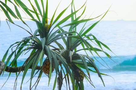 Branches of a tropical palm tree with fruits on the background of the sea. Sri Lanka