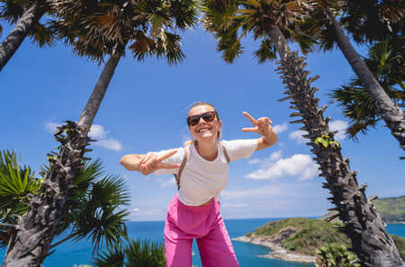 Young traveler woman at summer holiday vacation with beautiful palms and seascapes