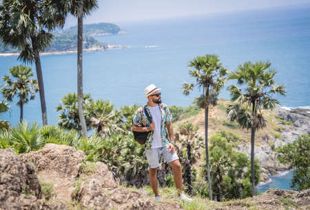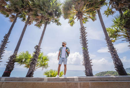 Young traveler man at summer holiday vacation with beautiful palms and seascapes at background