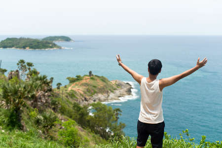 Young traveler man at summer holiday vacation with beautiful mountains and seascapes at background