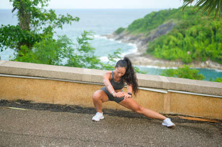 A Beautiful fit woman in sportswear exercising on seaside mountain peak, Health and Travel concept.