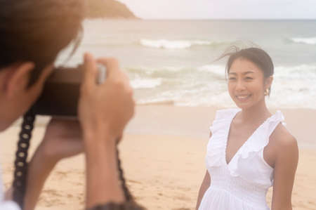 A Happy young couple wearing white dress enjoy taking photo on the beach on holidays, travel, romantic, wedding concept
