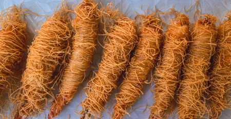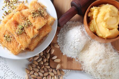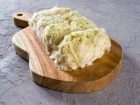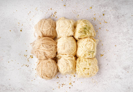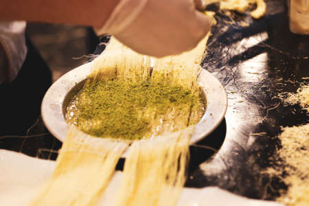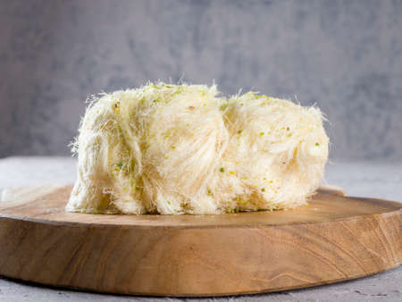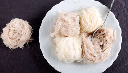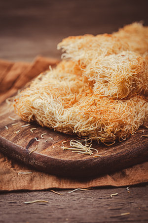 Butter roasted Kadayif pastry, fine dough threads for delicious sweet desserts, Turkish cuisine