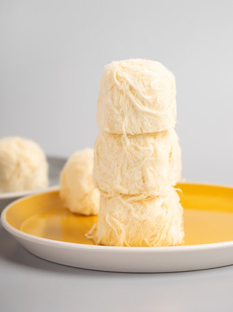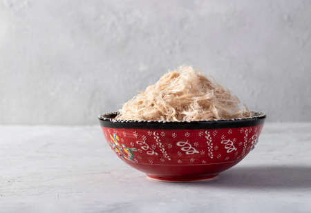 Traditional Turkish cotton candy Pismaniye in ceramic bowl on light gray stone background
