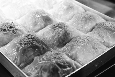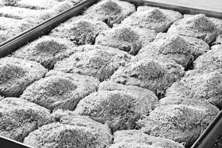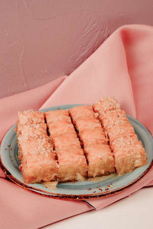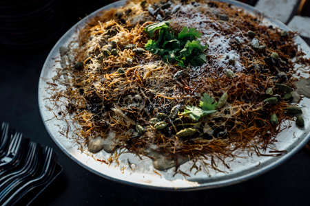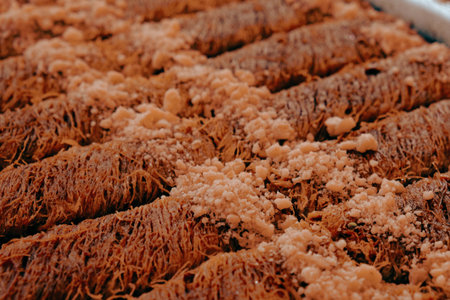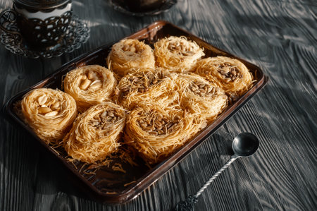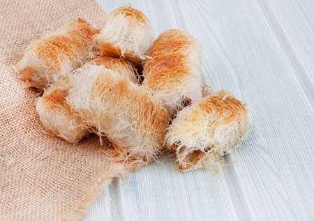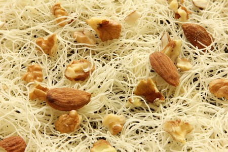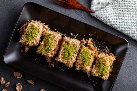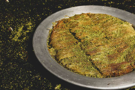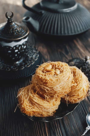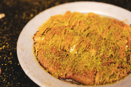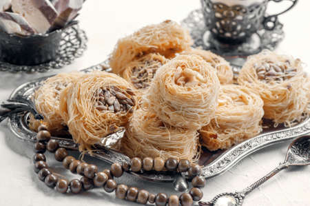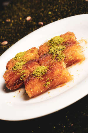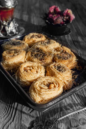 Arabic, Lebanese and Turkish sweets kataifi and kanafeh, a Traditional Eastern dessert made of thin dough with syrup, nuts and seeds. Close up.