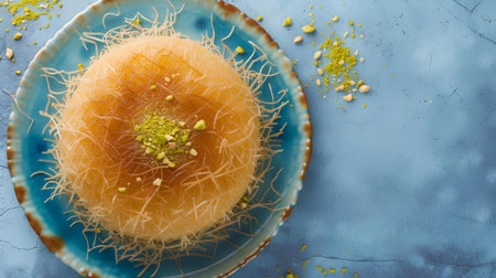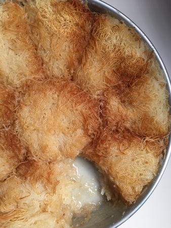 Traditional eastern dessert kunafa. Top view of arabic mixed cheese kunafa background. Konafa. Food background