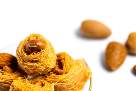 Arabic kadayif dessert with cashew nuts on a plate isolated