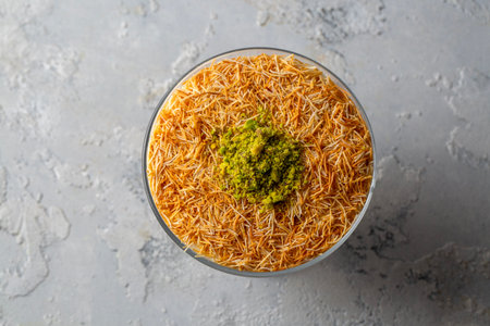 A traditional milk-based Ramadan dessert: fried kadayıf (shredded phyllo dough) and custard with sliced ​​pistachios. Kadafi Pudding